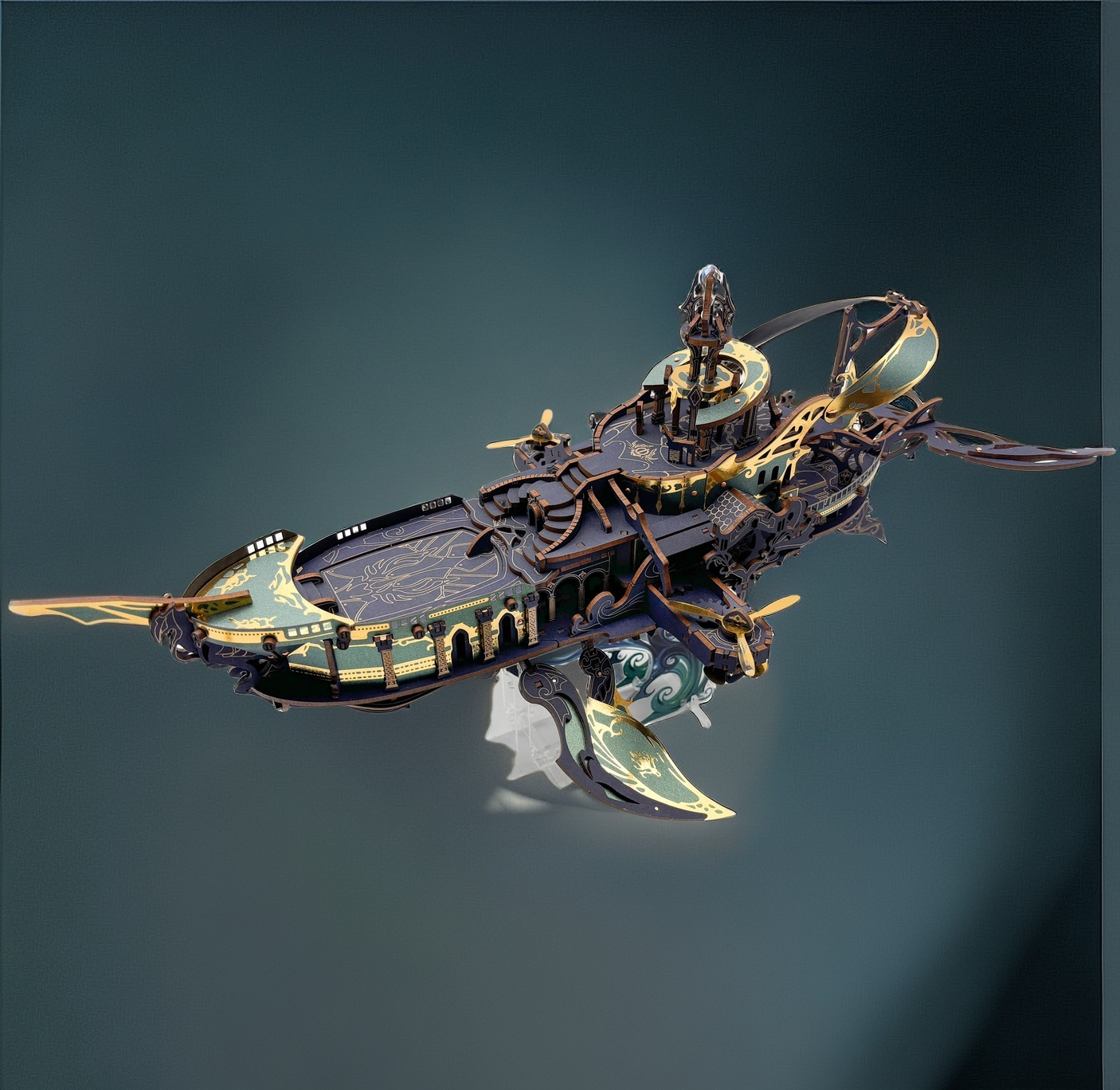 Touch-activated sonar panels emit harmonic resonance (20-40kHz), replicating cetacean bio-sonar frequencies described in Plato’s *Critias*.